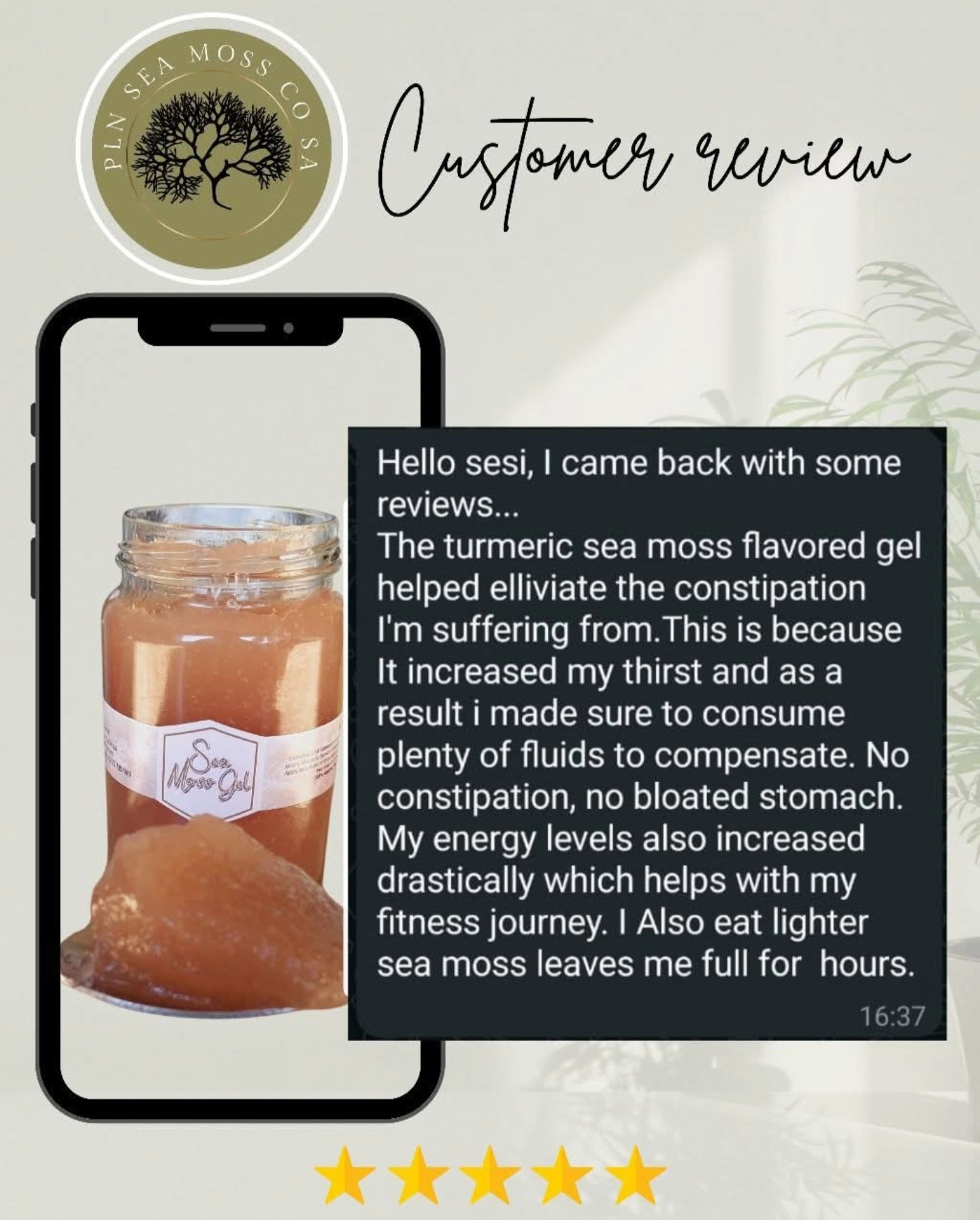 The turmeric sea moss flavoured gel helped elevate the constipation I'm suffering from. This is because it increased my thirst and as a result, I made sure to consume plenty of fluids to compensate. No constipation, no bloated stomach. My energy levels also increased drastically which helps with my fitness journey. I also eat lighter; sea moss leaves me full for hours."