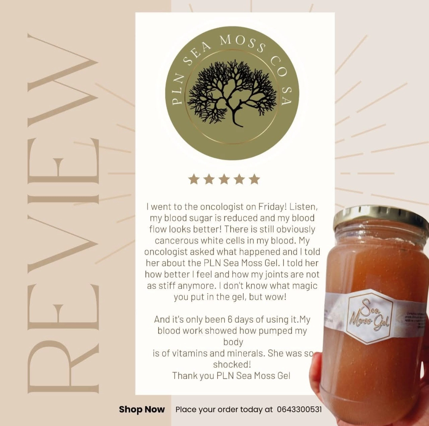 "I went to the oncologist on Friday! Listen, my blood sugar is reduced, and my blood flow looks better! There is still obviously cancerous white cells in my blood. MY oncologist asked what happened and I told her about the PLN Sea Moss Gel. I told her how better I feel and how my joints are not as stiff anymore. I don't know what magic you put in the gel, but wow! And it's only been 6 days of using it. My blood work showed how pumped my body is of vitamins & minerals. She was so shocked! Thank you, PLN Sea Moss Gel."